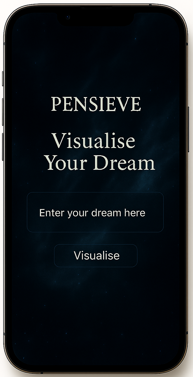 Pensieve is a dream-focused app that invites users to enter a written description of their dream and visualise it through AI-generated imagery or video. The experience unfolds through a simple, elegant flow: type your dream, tap “Visualise,” and watch it come to life.