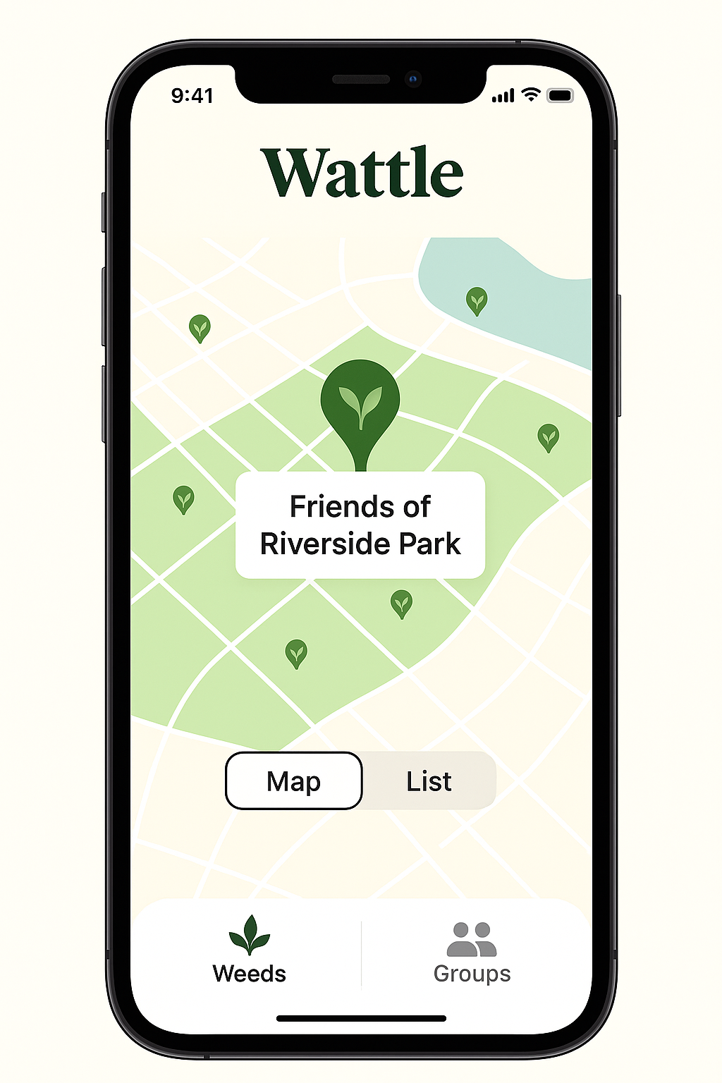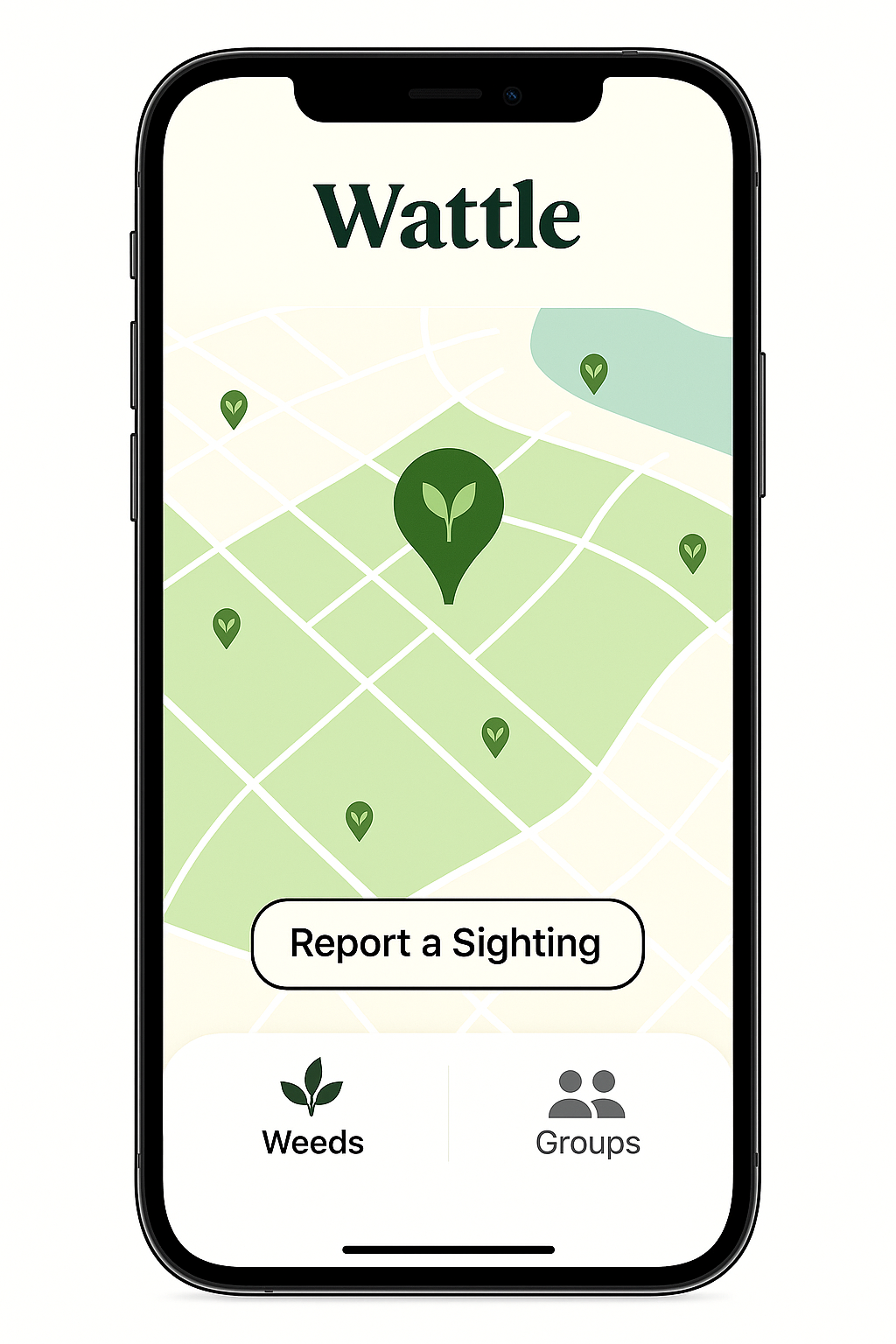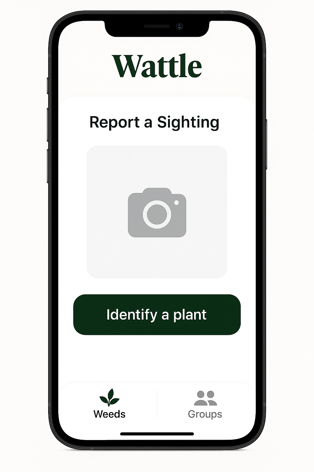 Wattle is a mobile app that empowers people to identify invasive weeds in their local environment and connect with nearby bush regeneration or conservation groups. Users can quickly snap a photo to detect and confirm a species, learn more about its impact, and contribute sightings to a shared map.